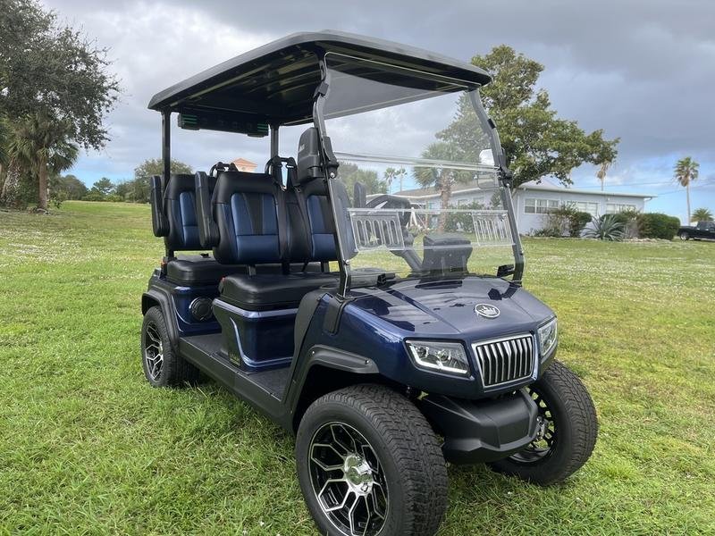 The 2025 Evolution D5 Ranger 4 in a stunning Mediterranean Blue is a luxury 4-seater golf cart with all forward-facing seats, a lithium battery, and a 9″ touchscreen. Find yours at Golf Carts Nation!