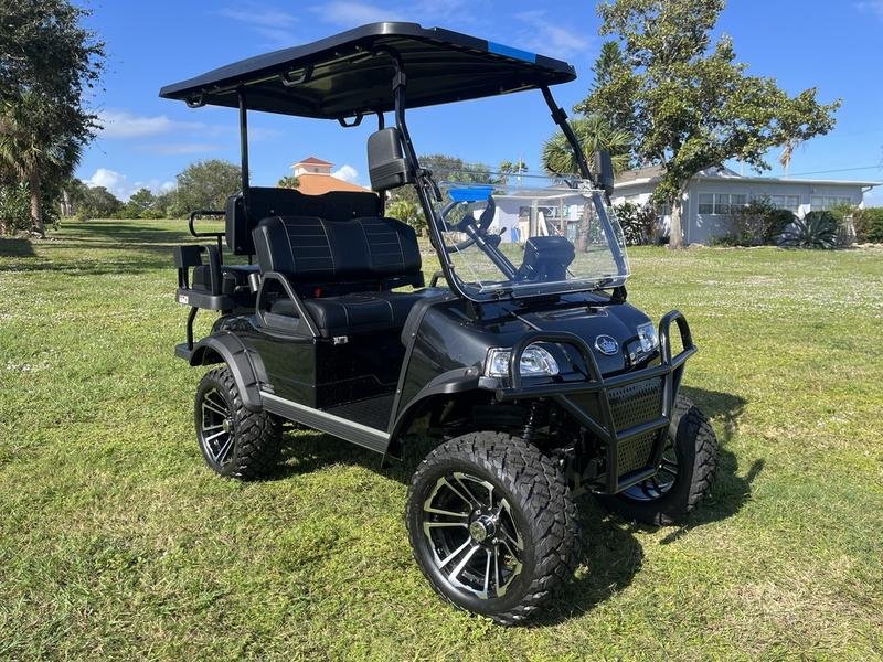The 2025 Evolution Forester 4 Plus in Mediterranean Blue is a 4-seater lifted golf cart with a powerful lithium battery, 9″ touchscreen with Apple CarPlay & Android Auto, and a rugged design.