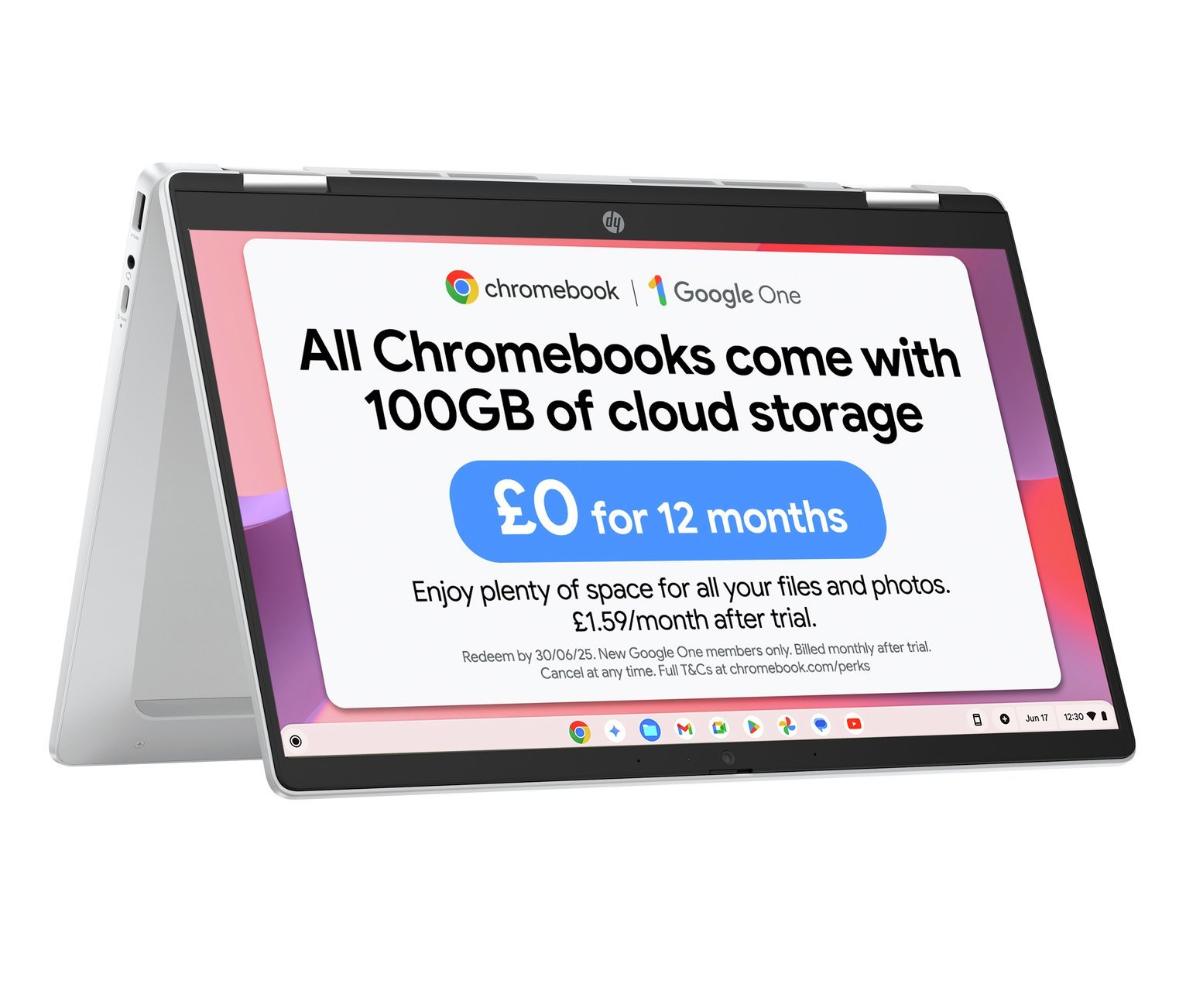 Power your everyday The HP Chromebook x360 14″ lets you power your day with the performance of up to an Intel processor paired with the ChromeOS and built-in virus protection. Enjoy long lasting battery life and a fast boot up to keep you going throughout the day. Plus the HP Chromebook is thoughtfully designed with sustainable materials. . Effortless productivity anywhere. Get everything done with up to an Intel processor, built-in Google apps, long lasting battery life and plenty of storage. . Turn up the entertainment, chat or collaborate. Turn down the noise and turn up your entertainment needs with the high quality camera and large 14″ display. . Designed with you in mind, with flexible x360 design, built-in protection and smart security features. . Camera Shutter. No more unsightly tape and tacky gum to hide your private moments. Ensure your privacy and security with a visible, physical shutter that turns off your PC’s camera when not in use. . Model number: 14b-cd0002na. . Part number: A2SA6EA. General features: Suitable for On the go.; Size H2.04, W32.3, D21.03cm.; Weight 1.37kg.; Up to 12 hours battery life. Actual battery life will vary based on configuration, power settings, and software usage, amongst other factors.; CPU, Memory and Operating System: Intel N – N100 processor.; Quad core processor.; 3.4GHz processor speed with a burst speed of 3.4GHz.; 4GB RAM LPDDR5.; 128GB UFS storage.; Operating System: Google Chrome OS (Pre-Installed).; Chrome.; Display features: 14 inch screen.; High definition display.; Full HD Display.; Resolution 1366 x 768 pixels.; Touchscreen.; Screen Type: SVA.; Brightness (Nits): 250.; Graphics: Intel UHD Graphics Intel UHD Graphics graphics card.; Shared graphics card.; Interfaces and connectivity: 1 USB 3.0 port.; 2 USB Type-C ports.; 1 USB Type-A port.; Headphones jack.; Bluetooth.; Wi-Fi enabled.; Multimedia features: HD webcam.; Built-in mic.; Built-in audio sound system.; Software Included: 100 GB Google One (1-year subscription included). . General information: Box Contents: Laptop; Battery; AC adapter; Power cord.; Manufacturer’s 1 year guarantee.; EAN: 198415022998.