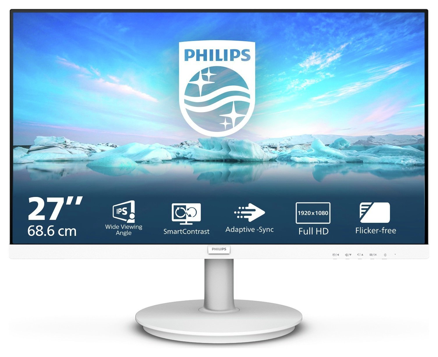Vivid, crisp images beyond boundaries. Philips V line wide-view monitor gives beyond boundaries, great value with essential features. Adaptive-Sync delivers smooth video display. Features like anti-glare, LowBlue mode and flicker-free for easy-on-the-eyes. . Perfectly designed for your space the compact design saves space and VESA mount allows for flexibility. Features: 27in IPS display.; Full HD (1080p) display resolution.; Resolution 1920 x 1080 pixels.; Full HD Display.; 75Hz refresh rate.; 4 ms response time.; Brightness 250cd/m2.; Contrast ratio 1000:1.; Built-in speakers.; Suitable for wall mounting.; VESA mount 100 x 100mm.; Interfaces and connectivity: Audio in, 1 HDMI port, VGA.; Digital input.; General Information: Tiltable screen.; Power saving facility.; Size H45.6, W61.3, D23.1cm.; Weight 3.74kg.; Energy efficiency class: E.; Energy Consumption per 1000h: 21kWh.; Manufacturer’s 1 year guarantee.; EAN: 8712581804398.