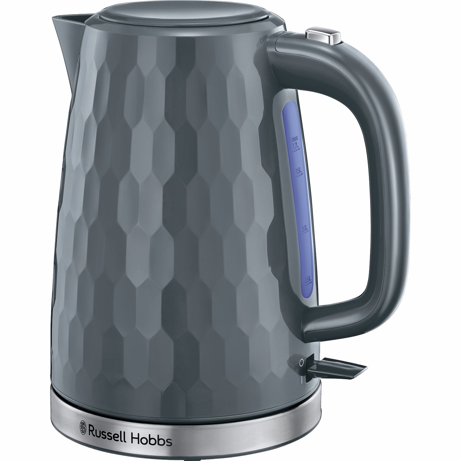 Heat water quickly and efficiently with the Russell Hobbs Honeycomb Grey Plastic Kettle. Its honeycomb-inspired design and stainless steel accents add a stylish touch to your kitchen without a complete redesign. The 1.7 L capacity is perfect for multiple cups, ideal for large households or catching up with friends over coffee. Practical rapid boil zone markers show how much water you’re adding, with 1, 2, and 3 cup indicators helping you boil just what you need. . Boil a cup in 43 seconds with the 3000W element, while the pour spout prevents spills. Features blue illumination when boiling, boil-dry protection, and a push-button lid for easy filling. Includes a removable limescale filter to maintain water quality and a 360 degree base. Comes with a 3-year warranty. . Colour: grey.; Plastic exterior.; Plastic interior.; Illuminated water window.; Blue illumination on boiling.; Rapid boil.; Boil dry protection – automatically switches off when the kettle is empty.; 1.7 litre capacity.; Push button operated lid.; Removable and washable limescale filter.; 3000W.; 360 degree base.; 0.61m cable from base to plug.; Manufacturer’s 3 year when registering online guarantee.; EAN: 5038061105391.
