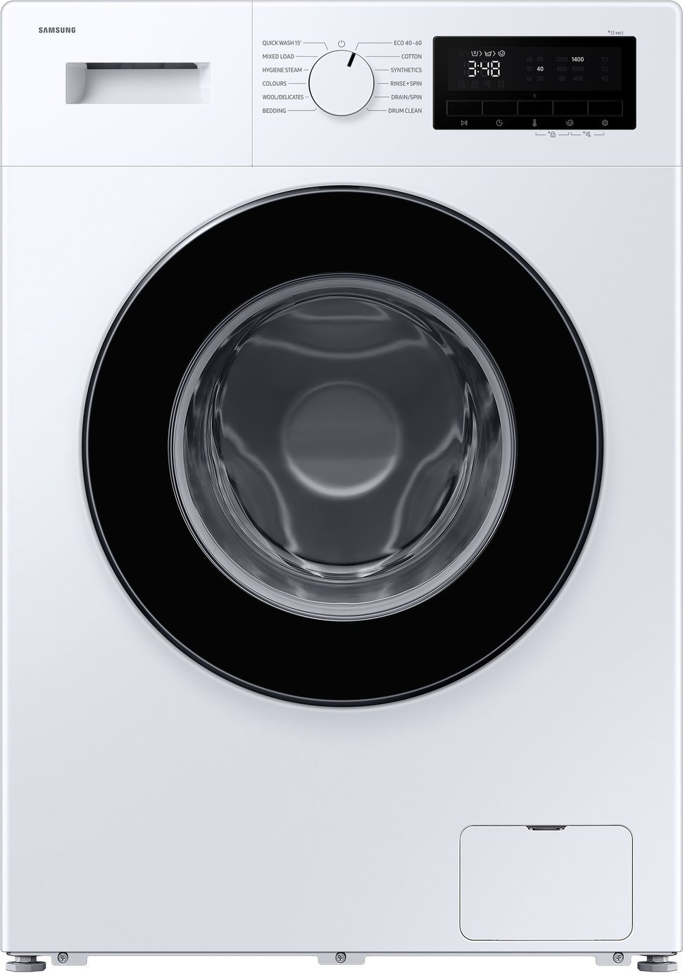 Hygiene Steam releases hot steam to eliminate bacteria. Drum Clean removes bacteria from the drum and seal. For lightlightly soiled clothes under 2kg, you can power through a 15 minute quick wash. . 15 minute Quick Wash For lightlightly soiled clothes under 2kg, you can power through a 15 minute quick wash. . Hygiene Steam Banish more than just stains and odours. The Hygiene Steam cycle on your Samsung washing machine releases hot steam, eliminating 99.9% of bacteria and inactivating allergens. Testing done by Intertek on Staphylococcus aureus and Escherichia coli and Dermatophagoides farinae Hughes, on 100% cotton, 3kg load. . Drum Clean Clean clothes start with a clean washing machine. Drum Clean removes odour-causing bacteria from the drum, without using any detergents. And after 40 cycles the machine reminds you to run it, so you’ll get the most out of every single wash. Overview: Wash capacity 9kg.; 12 programmes.; Variable spin speed.; Variable temperature.; 15 minute quick wash.; Manufacturer’s 2 year guarantee.; Size H85, W60, D51cm.; Programmes: Cottons.; Delicates.; Automatic half load.; Mixed.; Pre-wash option.; Quick wash.; Silks.; Spin and drain.; Synthetics.; Wool.; Controls: LCD display.; Dial control.; Time remaining indicator.; Performance: Energy efficiency class: A.; Energy consumption per 100 cycles: 49kWh.; Spin drying energy efficiency class: B.; Noise emissions: 76dB.; Noise emission class: B.; Water Consumption per Washing cycle: 50 litres.; Spin speed 1400rpm.; General features: Child lock.; Cold water fill.; Weight 64kg.; EAN: 8806097004813.