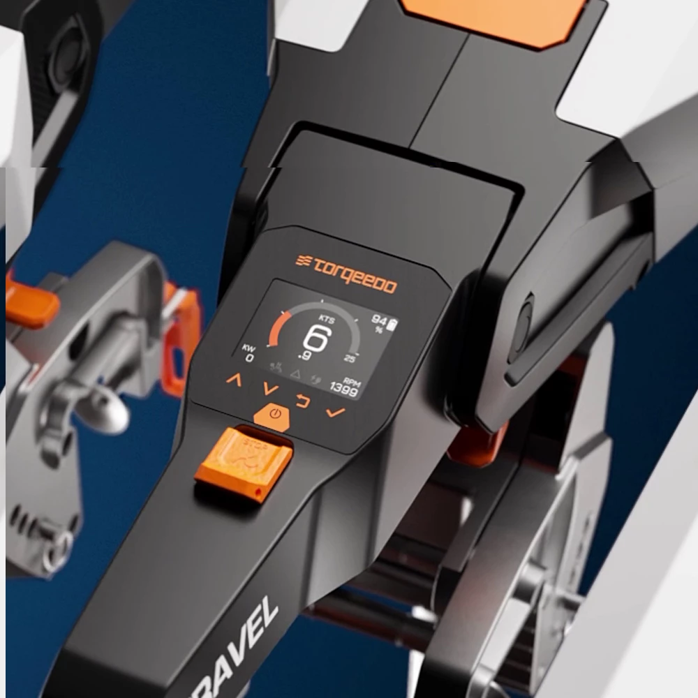 The all-new Torqeedo Travel range – redefined by the pioneers of Electric outboards, More power, greater range, featuring backlit colour displays, foldable and adjustable tillers and a cable free plug in battery.